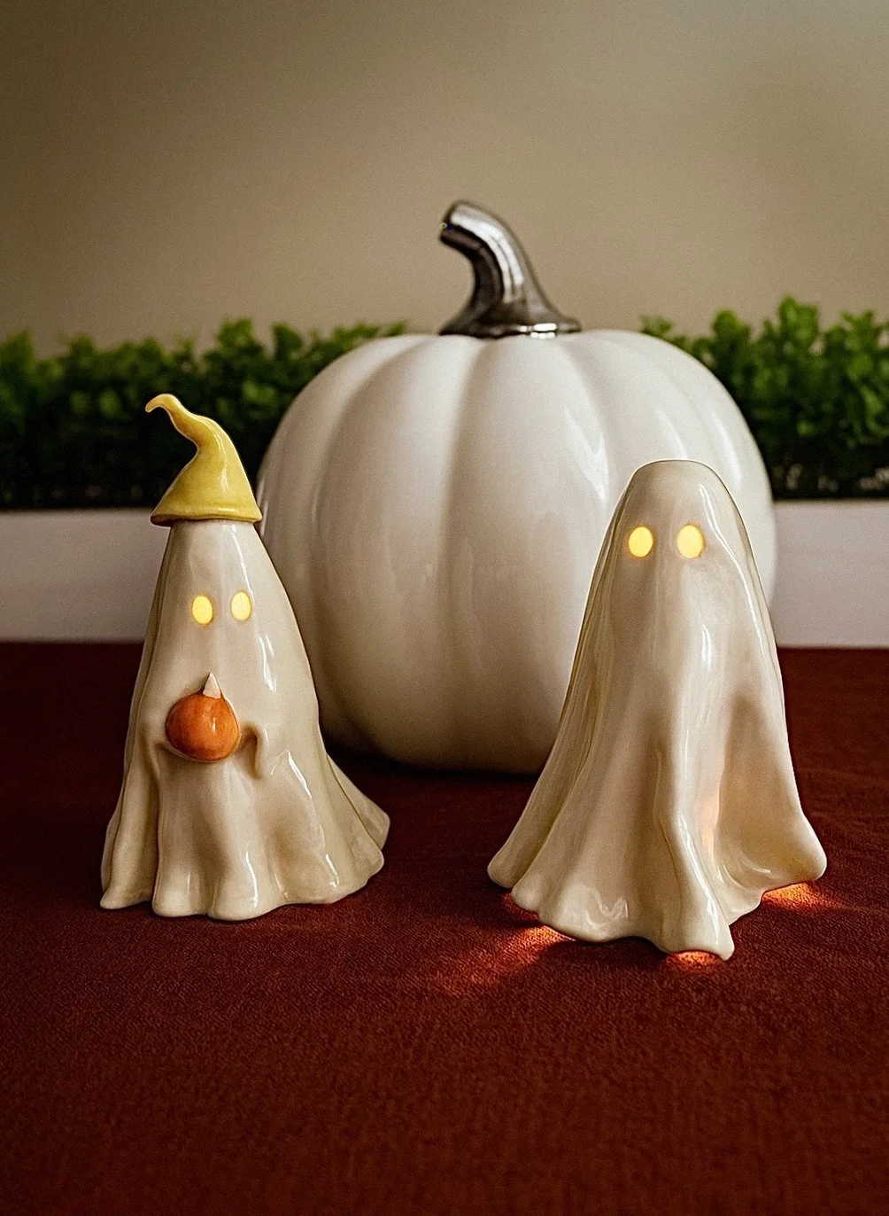 After the pieces are glazed and fired, we were invited to drop by and pick up our finished friends! As per Jackie’s recommendation, we kept our ghosts nice and hollow so we could add in some flickering votive lights as the cherries on top (or, rather, inside).